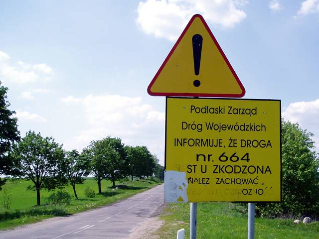 Uprzejmie informujemy Zarząd Dróg Wojewódzkich, że znak informujący o uszkodzeniu drogi też jest uszkodzony.